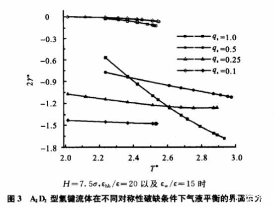 本文利用經典流體的密度泛函理論研究了受限于對稱性破缺狹縫間的A2D2型氫鍵流體的界面特征,并根據相應的結果討論了氫鍵能量、對稱性破缺程度以及狹縫間距對氫鍵流體氣液平衡界面張力的影響。相應結論主要如下: