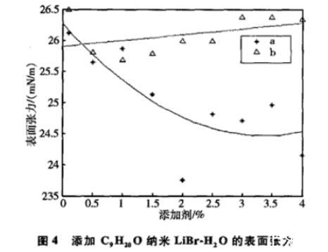 圖4添加C9H 20O納米LiBr-H 2O的表面張力