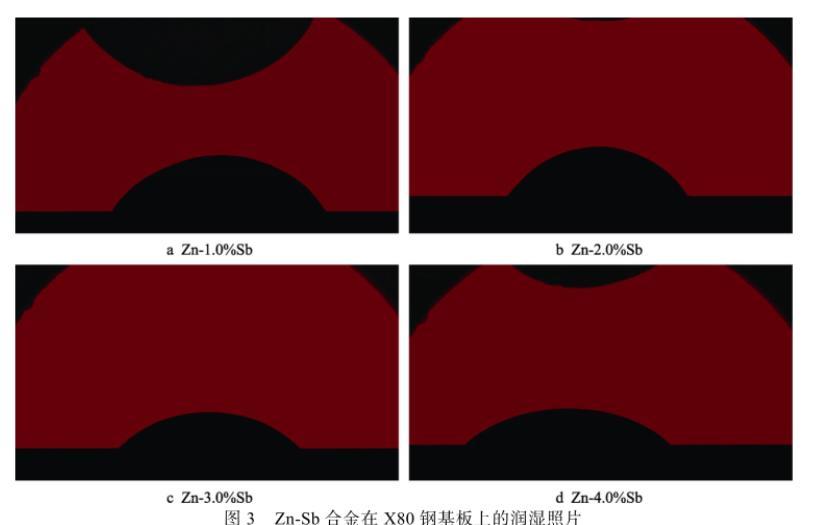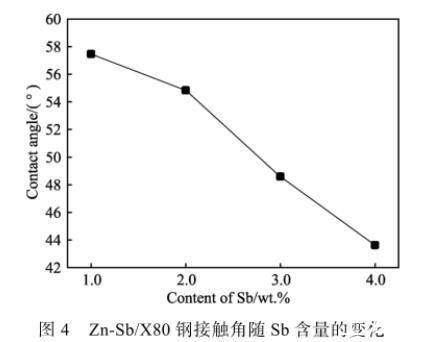 在實驗過程中,鋅合金熔體在基板上的潤濕時間很短,潤濕體系會很快達到平衡,且鋅合金熔體中Sb元素的添加量很少,根據Fe-Sb二元相圖可知,在450℃滴落溫度下,Fe與Sb之間的固溶度極小并無化合物生成,與X80鋼基板發生反應的元素主要是Zn,可以認為Sb添加對降低鋅液與X80鋼基體之間界面張力σsl的影響相對較小,由此Zn-Sb合金熔體與X80鋼基板之間的潤濕角主要取決于鋅合金熔體的表面張力σlv,表面張力σlv越小,接觸角越小,即鋅合金熔體與X80基板之間的潤濕性越好。