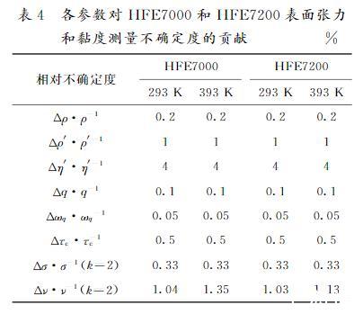 表4給出了式(11)、(12)中各參數(shù)對HFE7000和HFE7200表面張力和黏度在溫度上下限(T=293~393 K)的擴展測量不確定度的貢獻。其中,兩種物質在T=293 K時,表面張力擴展測量不確定度為0.33%,黏度擴展測量不確定度分別為1.04%和1.03%;當T=393 K時,表面張力擴展測量不確定度為0.33%,黏度擴展測量不確定度分別為1.35%和1.13%;表面張力的不確定度保持不變,隨著溫度的升高,黏度測量的擴展測量不確定度升高。越接近臨界溫度,氣相密度和黏度對擴展測量不確定度的貢獻越大。因此,本文HFE7000和HFE7200表面張力的擴展測量不確定度(置信因子k=2)估計為0.35%,黏度的擴展測量不確定度(k=2)分別估計為1.35%和1.13%。