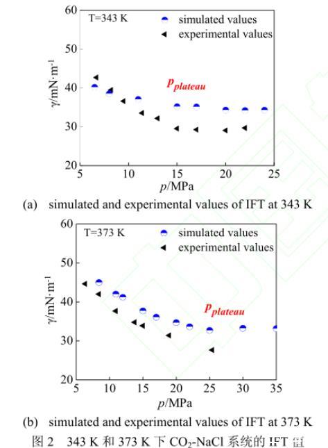 本文分別模擬了343 K和373 K的各壓強(qiáng)下鹽濃度為1.89 mol·L-1的CO2-NaCl系統(tǒng),IFT的計(jì)算結(jié)果示于圖2。由圖2可以看出,模擬所得的IFT值與Chalbaud等的實(shí)驗(yàn)數(shù)據(jù)吻合較好。在溫度為343 K時(shí)[圖2(a)],IFT值隨著壓強(qiáng)的不斷升高,其減幅逐漸下降,最終在壓力平衡點(diǎn)pplateau=15 MPa之后達(dá)到穩(wěn)定值34 mN·m-1。373 K時(shí)[圖2(b)]的IFT值變化與343 K時(shí)極為相似,IFT值同樣隨著壓強(qiáng)的升高而下降,且下降速度不斷趨于平緩,由于高壓情況下實(shí)驗(yàn)設(shè)備等因素受限制,實(shí)驗(yàn)方法尚未得到25 MPa以上的數(shù)據(jù)點(diǎn),故在實(shí)驗(yàn)壓強(qiáng)范圍內(nèi)并未觀測到壓力平衡點(diǎn)。而本文應(yīng)用分子模擬的方法,成功模擬了25~35 MPa下的CO2-NaCl系統(tǒng),觀測到壓強(qiáng)在pplateau=25 MPa之后達(dá)到穩(wěn)定值33 mN·m-1。