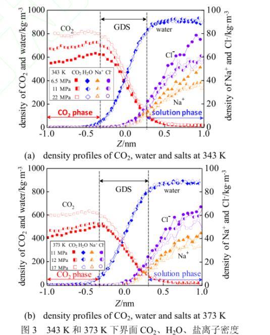 為從分子角度更加詳細(xì)地描述界面性質(zhì)的變化,本文選取并計(jì)算了界面處2 nm厚度區(qū)域的CO2、H2O、Na+及Cl-的密度,結(jié)果示于圖3。由圖3可以觀測到:當(dāng)從CO2相向溶液相過渡時(shí),CO2密度逐漸下降,H2O密度則逐漸上升;而鹽離子密度則從界面中心向溶液相,由0逐漸達(dá)到某一穩(wěn)定值。由圖3可以看出,溫度一定時(shí),CO2在CO2相的密度隨著壓強(qiáng)的升高逐漸升高。由[圖3(a)]可以看出,溫度為343 K時(shí),當(dāng)壓強(qiáng)由6.5 MPa升高至22 MPa,CO2相的CO2密度從580 kg·m-3升高至800 kg·m-3左右;而溫度為373 K時(shí)[圖3(b)],當(dāng)壓強(qiáng)由11 MPa升高至17 MPa,CO2相的CO2密度從約420 kg·m-3升高至600 kg·m-3左右。此外,對比圖3(a)和(b)還可知,當(dāng)壓強(qiáng)恒定在11 MPa時(shí),溫度由343 K升高到373 K,CO2相的CO2密度則由700 kg·m-3降至420 kg·m-3左右。