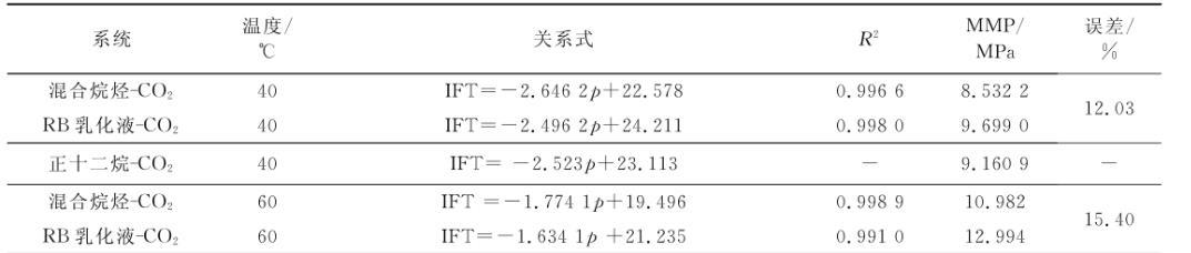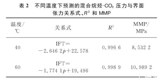 將擬合直線向橫軸方向繼續延伸,與壓力軸會有一個交點,該交點的物理意義即界面張力為零時的壓力大小。根據CO2的驅油機理和最小混相壓力所表現的特征,該點的橫坐標值即為實驗對象在特定溫度下的MMP。表2列出了40℃和60℃下所測氣液之間的壓力與界面張力的關系式和相關系數,以及對最小混相壓力的預測。