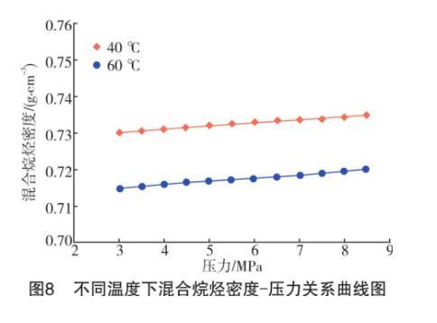 從混合烷烴密度-壓力曲線(見圖8)來看,整個測試壓力區間內溫度對混合烷烴的密度影響不大,因此液體密度也不會造成界面張力的較大變化。從CO2密度-壓力曲線(見圖7)來看,溫度在中高壓下對CO2密度的影響較大。尤其是在3.5 MPa之后,60℃下的氣體密度隨著壓力升高速率明顯高于40℃時的速率。在同一壓力下,氣體密度隨著溫度升高顯著降低。密度較低的CO2氣體分子分布越稀疏,與烷烴液面直接接觸的氣體分子越少,故降低了二者發生萃取和混溶的概率,間接地導致液體的界面張力值增加。