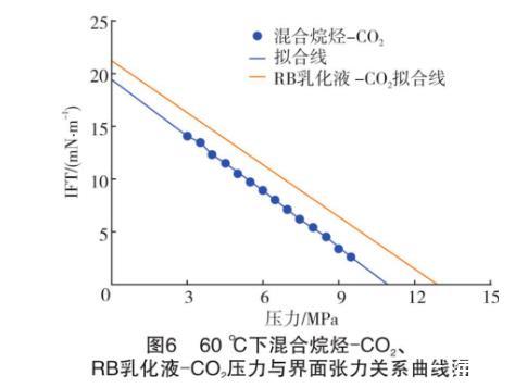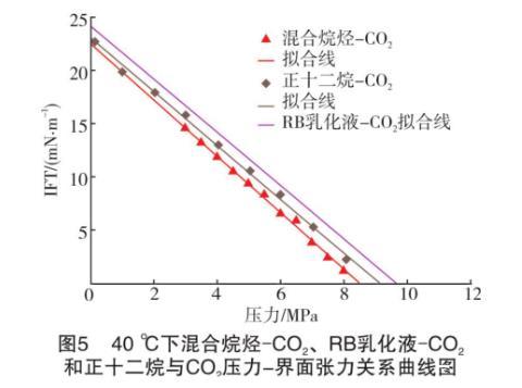 假設RB乳化液-原油不考慮斜率變化部分,始終以低壓階段(小于6 MPa)的斜率表示界面張力的變化。將表中同一溫度下不同系統的關系式展現在曲線圖上(見圖5和圖6)。從圖5和圖6可知,不論在哪個溫度下,混合烷烴和RB乳化液的壓力-界面張力曲線都接近平行,即兩種油的界面張力隨著壓力的升高幾乎以同樣的速度降低。計算得知,40℃和60℃下實驗混合烷烴和RB原油的壓力-界面張力關系式中的斜率誤差為6.0%和8.6%。縱觀兩種油的組成發現,本實驗所使用的混合烷烴中正十二烷的摩爾分數達71.07%,而RB原油中的C12+的摩爾分數達到57.66%。也就是說,混合烷烴和原油的組分中占主導作用的是高碳數的正構烷烴。據姬澤敏等的大量實驗研究,界面張力在不同的正構烷烴-CO2體系中具有極好的規律性,在相同的溫度壓力條件下,正構烷烴的碳數和界面張力成正比關系。從文獻中RB原油組成分析得知,C12+的分子量高達366 g/mol,而本實驗中的混合烷烴的分子量僅為156.74 g/mol。由此得知,實驗誤差的主要來源是高碳正構烷烴的組成不同。