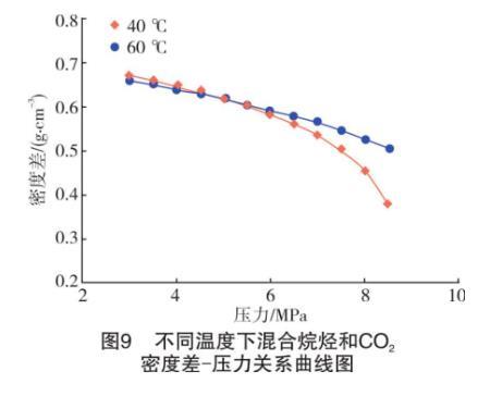 一方面,高溫可以對液體分子之間的相互作用力產生削弱作用,加劇分子間的不規則運動。此時,CO2氣體分子更容易與液相發生混溶,而定量表現出來的就是界面張力的降低。另一方面,根據混合烷烴和CO2的密度和二者的密度差數據,繪制出不同溫度下CO2氣體密度和氣液密度差隨壓力升高的變化曲線,如圖7~圖9所示。從密度差-壓力曲線(見圖9)來看,隨著溫度升高,在可比較的實驗壓力范圍內,中低壓(3~6 MPa)下不同溫度的氣液密度差非常接近,可以忽略不計。但高于6 MPa后,高溫下氣液密度差逐漸加大。較高的密度差導致了氣液難以形成混相,同一壓力下界面張力更大。