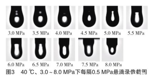 實驗后得到的直接數據是一系列的懸滴錄像,圖片示例如圖3所示。根據錄像計算不同溫壓下混合烷烴和CO2的界面張力。