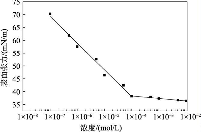 配制不同濃度TAC水溶液,測定溫度298.15 K,繪制溶液的表面張力隨濃度的變化曲線。在某一濃度前后,表面張力-濃度曲線會形成兩條斜率不同的直線,這兩條直線的交點即為臨界膠束濃度(CMC)。