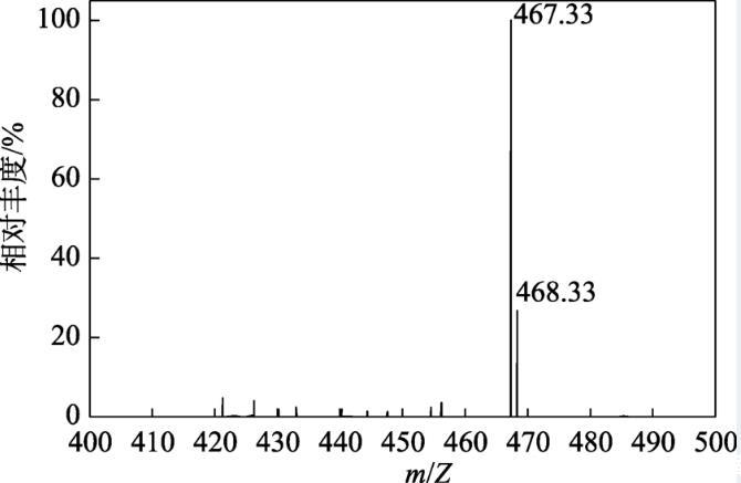 圖4為TAC的MS譜圖。從圖4可以看出,在正離子檢測模式下檢測到最大豐度的質譜信號為m/Z=467.33,m/Z=468.33為[M+1],即正峰MS信號。TAC相對分子質量測量值與計算值一致。