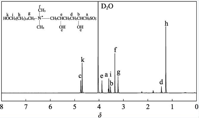 圖2為TAC的1 HNMR譜圖。從圖2可以看出,δ3.60(a)為TAC中—CH 2 SO–3的質子峰,δ3.50~3.87(b、e)為TAC中—CH—的質子峰,δ4.70~4.77(c、k)為TAC中—OH的質子峰,δ1.40(d)為TAC中—CH 2 CH 2—的質子峰,δ3.30(f)為TAC中N—(CH 3)2的質子峰,δ3.22(g)為TAC中N—CH 2的質子峰,δ1.26(h)為TAC中—(CH 2)14—的質子峰,δ3.62(i)為TAC中—CH 2—的質子峰。
