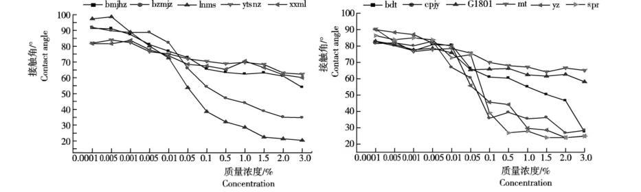圖1 5種農藥和6種助劑不同濃度藥液與辣椒葉面的接觸角