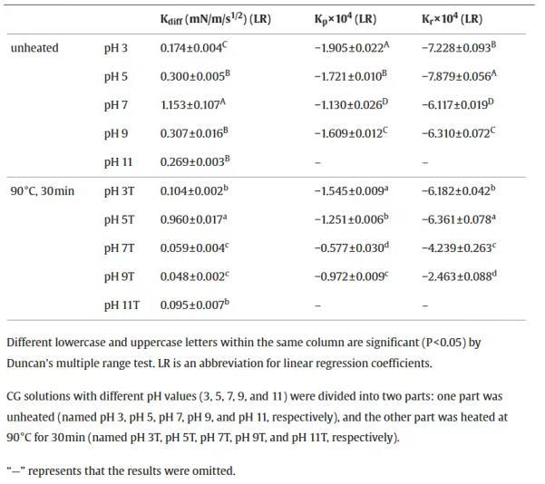 Kdiff、Kp和Kr的最高值分別為pH值7、3和5。柔性蛋白可以在油水界面上更快地吸附和重新排列。pH為3時CG靈活的二級結(jié)構(gòu),使其具有更好的吸附動力學(xué),。pH 5(接近pI 4.3)的CG更弱的靜電斥力,引起了更好的結(jié)構(gòu)重排。加熱后,除pH值為5時CG的Kdiff外,所有樣品的Kdiff、Kp和Kr均有所下降。加熱后的CG具有較低的初始界面張力和較短的平衡吸附時間(圖1a),它能迅速達(dá)到平衡狀態(tài),并且吸附動力學(xué)指數(shù)較低。此外,加熱后的CG表現(xiàn)出顯著的變性和聚集,殘留的蛋白質(zhì)分子會產(chǎn)生空間位阻,從而阻礙聚集后的CG到達(dá)油水界面。此外,不溶性CG聚集體對殘留CG分子的吸附產(chǎn)生了屏障。CG在pH為5時,蛋白質(zhì)形成大量沉淀,溶解度僅為12.05%。可溶性蛋白含量低意味著較弱的靜電排斥力,這使剩余的蛋白更容易擴散,從而導(dǎo)致最高的Kdiff。與動態(tài)界面張力相比,CG與pH 5T的吸附動力學(xué)不受蛋白質(zhì)濃度的影響。
