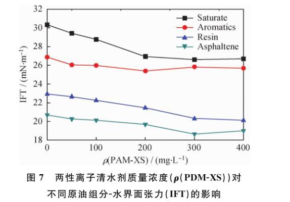 圖7兩性離子清水劑質量濃度(ρ(PDM-XS))對不同原油組分-水界面張力(IFT)的影響