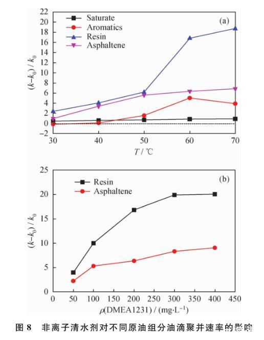 圖8非離子清水劑對不同原油組分油滴聚并速率的影響