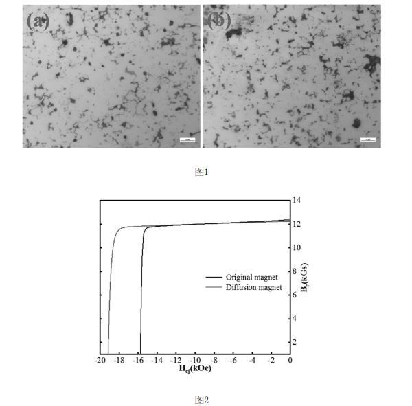 釹鐵硼磁體因具備高磁能積、高矯頑力等優(yōu)異的磁學(xué)性能已被廣泛應(yīng)用在電子信息、新能源汽車、風(fēng)力發(fā)電等領(lǐng)域。隨著科技的進(jìn)步,市場對釹鐵硼磁體的磁性能提出了更高的要求。傳統(tǒng)的高矯頑力磁體制備方法需要使用大量的重稀土元素(Dy/Tb),不但增加了成本,同時還造成剩磁和最大磁能積的下降。而晶界擴散工藝在實現(xiàn)大幅度提升矯頑力的同時可以保證剩磁幾乎沒有損失,是高矯頑力釹鐵硼磁體降低成本的重要制備方法。根據(jù)燒結(jié)釹鐵硼永磁體的矯頑力機制,反磁化疇首先在晶粒表面形成,晶粒表面是磁體內(nèi)最薄弱的環(huán)節(jié),提高晶粒表面的各向異性場可以推遲反磁化疇核的形成,從而提高整個磁體的矯頑力,晶界擴散就是基于這一原理提出的。
