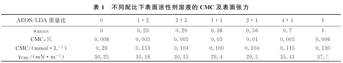 在25℃測試了AEO3S和烷醇酰胺LDA表面活性劑及其在不同質(zhì)量配比下溶液的表面張力,實驗結果見圖1。根據(jù)相對分子質(zhì)量計算出表面活性劑AEO3S的摩爾分數(shù)(αAEO3S)。由圖1中濃度與表面張力的關系得到溶液的CMC及對應濃度下的表面張力,實驗結果見表1。