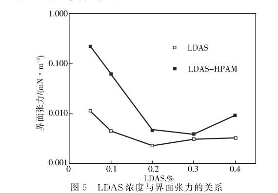 由圖5可知,無論溶液有無聚合物存在,隨著復配表面活性劑LDAS濃度的增加界面張力呈現先下降而后略有增加的現象。無聚合物時,活性劑LDAS濃度在0.1%~0.4%時界面張力均處于超低界面張力范圍;加入0.12%HPAM后,油水界面張力略有上升,但0.2%和0.3%LDAS溶液與魏崗原油間的界面張力仍然很低,分別為0.003 8 mN/m和0.004 5 mN/m,表明復配表面活性劑體系具有很高的界面活性。
