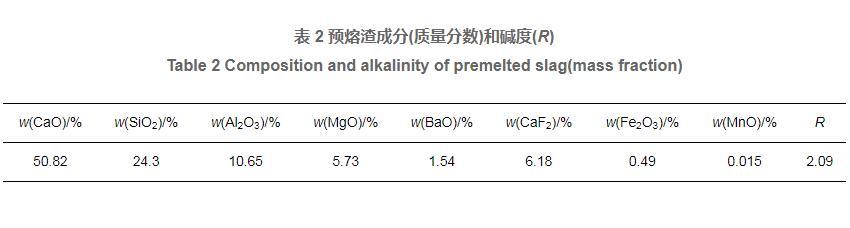 表2預熔渣成分(質量分數)和堿度(R)