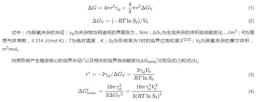 實際煉鋼脫氧的過程中,新相形核是以均質形核和非均質形核2種方式進行的。脫氧生成1個半徑為r的球形夾雜時,總自由能的變化為ΔG,在數值上為生成新相產生的表面能和引起體積變化的自由能之和[20],見式(1)。生成夾雜的體積自由能變化ΔGV見式(2)。