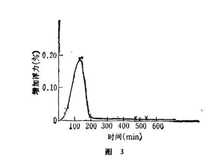 測試條件:水流速v=0.745m/s;水溫T=18.0±0.3℃;電場頻率3.5MHz;用長春市自來水。測試時間為1984年9月21日。電水的浮力和時間關系見圖3。