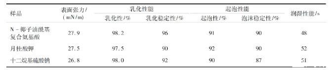 以大豆為原料合成的N-椰子油酰基復合氨基酸表面活性劑表面張力、乳化起泡潤濕性能測定(二)