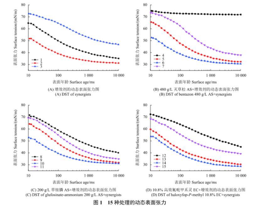 測定結(jié)果如圖1(A)所示:處理2降低表面張力的速度最快,且在10 000 ms時表面張力達(dá)到最小值,處理3降低表面張力的速度最慢,說明2#增效劑的效果最好,3#增效劑最差。與未添加增效劑的處理(4,8,12)相比,添加增效劑后除草劑表面張力的降低速度更快,10 000 ms時所達(dá)到的靜態(tài)表面張力值也更小,其中也是2#增效劑的效果最好。