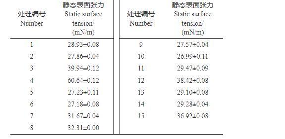 1.2.1靜態(tài)表面張力測定參照文獻(xiàn)方法測定。在(25±1)℃下,用0.3 mm的鉑金環(huán)(外徑20.30 mm,周長61.89 mm,密度0.998 g/mL)在全自動張力儀上先用純水進(jìn)行校準(zhǔn),然后測定表1中15種處理的靜態(tài)表面張力,每個試驗至少重復(fù)3次,結(jié)果取平均值,用Origin Pro軟件(9.0版,OriginLab公司)處理數(shù)據(jù)。