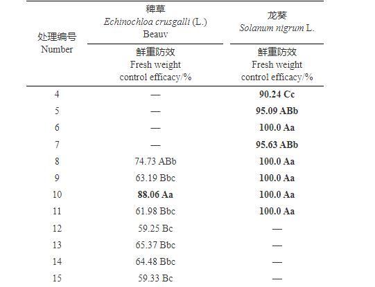 由表5數據可以看出,處理4~7對龍葵鮮重防效均在90%以上,其中最好的是添加了2#增效劑的處理6,鮮重防效為100%,其次是添加了1#增效劑的處理5和添加了3#增效劑的處理7,最差的是未添加增效劑的處理4,處理5~6與處理4差異顯著,處理6與處理5、7在0.05水平上差異顯著。處理8~11對龍葵效果均較佳,鮮重防效均為100%;對稗草防治效果最好的是添加了2#增效劑的處理10,鮮重防效為88.06%,其他處理防效略差,鮮重防效在61%~74%之間,處理10與處理8、9、11在0.05水平上差異顯著。處理12~15對稗草的防治效果均一般,鮮重防效在59%~65%之間。