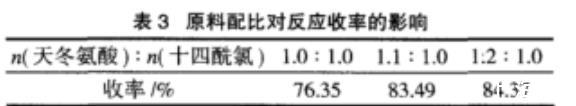 采用天冬氨酸稍過量,一方面可以抑制酰氯的水解,另一方面又有利于提純。選取n(天冬氨酸)∶n(十四酰氯)=1.0~1.2∶1.0。在反應體系pH=10~11、反應時間3.5h、反應溫度5℃條件下,考察不同原料配比對反應的影響,結果如表3所示。
