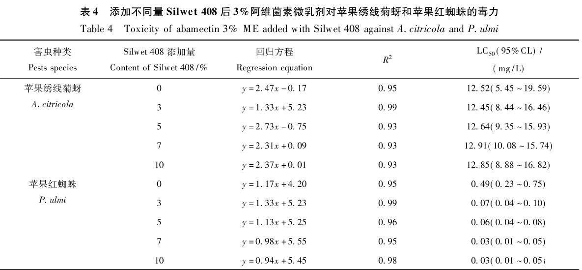 從表4中數據可看出:添加Silwet408可明顯提高阿維菌素微乳劑對蘋果紅蜘蛛的毒力,且隨助劑添加量的增加,藥劑LC50值降低;但添加Silwet408對阿維菌素微乳劑對蘋果繡線菊蚜的毒力并無明顯影響。說明Silwet408雖能降低藥液的表面張力及在靶標葉面的接觸角,促進藥液在葉片上的潤濕性,但并不一定能提高其對害蟲的毒力。