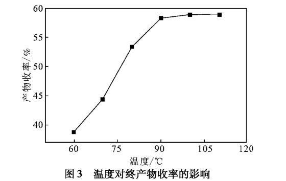 由圖3可知,GAC-312的收率隨反應溫度的升高而增大,從60℃上升至90℃過程中,產物收率的增幅很明顯,提高了多達二十個百分點;但當溫度超過90℃后,產率增加不明顯且反應體系的揮發現象較嚴重。這主要是因為升高反應體系溫度,活化分子數增加,有效碰撞的幾率加大,反應速率加快。但當溫度過高時,會導致副反應速率增大,同時也會提高體系揮發速率,造成N,N-二(3-氯-2-羥基丙烷-N-十二烷基仲胺)丙二胺二乙酸鈉產率提升不大,因此,N,N-二(3-氯-2-羥基丙烷)丙二胺二乙酸鈉與十二胺的最佳反應溫度確定為90℃。