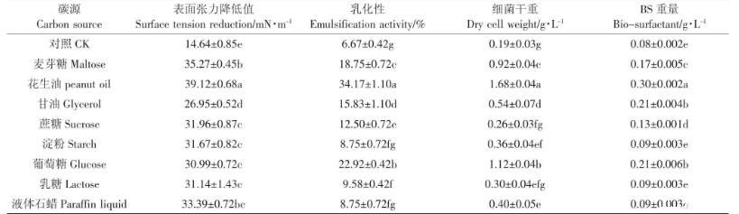 碳源對細菌的生長與發(fā)酵產(chǎn)物量有重要影響。銅綠假單胞菌(Pseudomonas aeruginosa)可在多種類型碳源下產(chǎn)生生物表面活性劑,包括甘油、乙醇、植物油等。由表3可知,以花生油為碳源,細菌發(fā)酵液的降低值為39.12 mN·m-1,明顯高于其他碳源類型;乳化值為34.17%,稍高于其他碳源,此時細菌生物量最大,糖脂含量最高,為0.30 g·L-1。雖然花生油作為碳源,能夠促進菌株產(chǎn)生更多生物表面活性劑,但如果用于實際生產(chǎn),成本相對較高,近年來一些研究者嘗試使用成本較低的工業(yè)副產(chǎn)物如糖蜜、廢潤滑油等作為碳源,發(fā)現(xiàn)也具有很好的促進微生物產(chǎn)生生物表面活性劑的作用。因此,后期會考慮選擇用一些低成本碳源進行發(fā)酵。