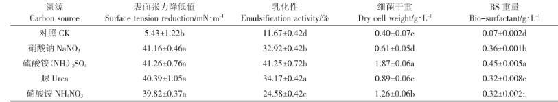 細胞表面的物質(zhì)合成需要氮源,氮源的種類會對細菌細胞的生長和發(fā)酵產(chǎn)物的產(chǎn)量產(chǎn)生很大影響。由表4可以看出,不同氮源對細菌發(fā)酵過程中表面張力降低值的影響較小,可能與發(fā)酵液中的生物表面活性劑含量已經(jīng)達臨界膠束濃度(CMC)有關。當?shù)礊榱蛩徜@時發(fā)酵液表面張力降低值最大,同時乳化性、細菌干重、糖脂含量均達到最大值。這與錢曉勇等研究結(jié)果一致,硫酸銨是促進生物表面活性劑生成的較好氮源。