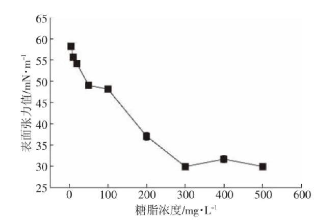 發(fā)酵產(chǎn)物臨界膠束濃度是指分子在溶劑中締合形成膠束的最低濃度。臨界膠束濃度(Critical micelle0.005 concentration,CMC)可以作為表面活性劑表面活性的一種度量,CMC越小,改變表/界面性質(zhì),起到增溶、乳化等所需的濃度就越低。從圖3可以看出:糖脂在0~300 mg·L-1時,表面張力值隨著糖脂濃度的升高而降低,且在300 mg·L-1時達到最小值;在300~500 mg·L-1時,表面張力值變化不大。可得發(fā)酵粗提產(chǎn)物的CMC為300 mg·L-1,明顯低于普通化學表面活性劑十二烷基磺酸鈉(SDS)的2200 mg·L-1,能在較低濃度下使用,因而在醫(yī)藥、食品、化工等行業(yè)具有廣闊應用前景。