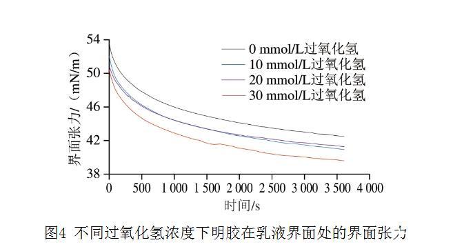 兩親性蛋白質促進蛋白質吸附到油-水界面并降低油相和水相之間的界面張力,從而形成穩定的界面層。如圖4所示,氧化組的明膠界面張力均低于對照組,這表明所有明膠樣品均具有表面活性。明膠在油-水界面處的界面張力隨著過氧化氫濃度的增加而降低。不同過氧化氫濃度下明膠的界面張力隨時間的延長逐漸降低,從未氧化組的53.8 mN/m下降到30 mmol/L組的50.7 mN/m。界面張力隨著吸附時間的延長而降低,下降速率逐漸減小,這反映了蛋白質在界面上的吸附和覆蓋。明膠界面張力的下降與其更好的兩親性有關。因此,在本研究中氧化導致明膠水接觸角的增加,提高了明膠的疏水性并改善了明膠的兩親性,增加了蛋白質向油-水界面的吸附,這可能引起油-水界面張力的下降。Feng Xin等支持這一觀點并報道,在豬皮明膠的提取過程中提高提取溫度也會引起界面張力的降低,并認為隨著提取溫度的升高會破壞明膠原有的三螺旋結構,從而暴露出更多的疏水基團,這促使明膠分子能夠更快地吸附到油-水界面上,從而更大程度地降低界面張力。