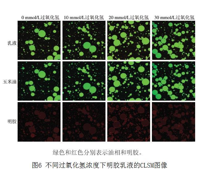 如圖5所示,明膠乳液的Zeta電位隨過氧化氫濃度的增加而降低,對照組為9.61 mV,隨著過氧化氫濃度增加至30 mmol/L,Zeta電位降低至5.94 mV,降低40%。乳液液滴Zeta電位的降低也表現出液滴間較小的靜電斥力。據報道,靜電和空間穩定是蛋白質乳液液滴穩定的重要機制。在本研究中,氧化明膠乳液ESI下降可能也與乳液液滴間靜電斥力的下降有關。Yang Yaqin等通過探究pH值對蛋黃、蛋白乳化能力的影響支持這一觀點,發現當溶液的pH值接近蛋白質的等電點時,乳液液滴之間的靜電斥力會降低,從而加劇油滴的聚集。然而,也有研究表明,虎河豚皮明膠的乳化性能也容易受到pH值的影響。該研究發現,對于pH 6的虎河豚皮明膠,明膠分子之間強靜電斥力可能會抑制蛋白質去折疊并阻礙蛋白質分子轉移到界面上,從而導致虎河豚皮明膠的EAI較低。而當虎河豚皮明膠pH值為8時,明膠分子之間較弱的靜電斥力可以促進蛋白質分子的去折疊并促進其向界面的遷移,從而提高EAI。此外,該研究表明,蛋白質分子間較強的靜電斥力還會破壞界面膜的穩定性,導致ESI降低。