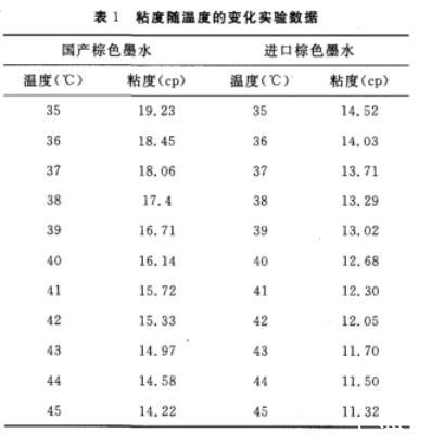 3)進(jìn)口陶瓷墨水與國產(chǎn)陶瓷墨水相比,內(nèi)在的性能參數(shù)(表面張力、粘度、容重)隨溫度變化的規(guī)律一致。