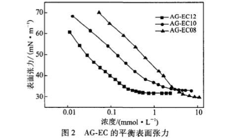 以去離子水為溶劑配制不同濃度的AG.EC溶液,靜置12 h后利用krussK12表面張力儀通過wilhelmy吊片法測定其平衡表面張力。控制溶液溫度(254-0.3)clC,測定前去離子水校準表面張力儀至(72±0.3)mN/m。由表面張力()一濃度對數(1gc)圖,可得AG.EC在水中的臨界膠束濃度(cmc)以及cmc下的表面張力(一)。