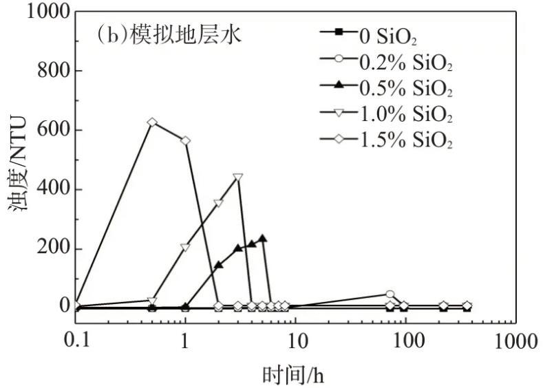 利用沉降法和濁度法分析分別用NaCl鹽水、模擬地層水配制的不同納米SiO2含量的納米SiO2/SDS體系的穩定性,濁度法測試結果如圖1所示。用NaCl鹽水配制的SiO2/SDS體系在靜置15 d時,僅納米SiO2質量分數為1.5%的體系出現了輕微的渾濁,而其它體系均保持澄清透明;當納米SiO2質量分數為1.5%時,SiO2/SDS體系的濁度隨靜置時間的延長稍有增大,其它體系的濁度幾乎不隨靜置時間的延長而變化,且均小于15 NTU。由此可見,用NaCl鹽水配制的納米SiO2/SDS體系的穩定性良好。