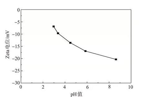 以納米SiO2質量分數為0.5%時的體系為研究對象,分析了不同pH值時體系的Zeta電位,結果見圖3。隨著pH值的降低,納米SiO2/SDS體系的|ζ|減小且明顯小于30 mV,但是穩定性卻得到了明顯改善。該實驗現象與傳統的DLVO理論產生了明顯的矛盾,這是因為DLVO理論沒有考慮到短程排斥力的存在。水溶液中顆粒表面形成具有一定彈性的水化膜,當兩個顆粒靠近時,顆粒表面的水化膜在靠近重疊時產生一種短程的非DLVO作用力使兩個顆粒被彈開,該作用力稱為水化作用力。