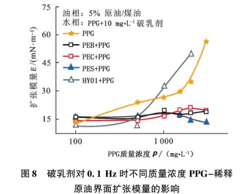 圖8破乳劑對(duì)0.1 Hz時(shí)不同質(zhì)量濃度PPG-稀釋原油界面擴(kuò)張模量的影響