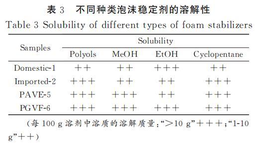 聚氨酯發(fā)泡過程中,各原料之間的相容性對泡沫的性能有重要影響。相容性好的原料可以確保發(fā)泡過程中的化學(xué)反應(yīng)順利且充分進(jìn)行,從而獲得均勻、細(xì)膩的泡沫結(jié)構(gòu),提高泡沫的物理性能和使用性能。表3是不同種類泡沫穩(wěn)定劑在不同溶劑中的溶解性測試,通過測試結(jié)果可知,經(jīng)過接枝改性后的PAVE-5和PGVF-6在多元醇和環(huán)戊烷中的溶解性較好,和國產(chǎn)-1、進(jìn)口-2等泡沫穩(wěn)定劑都能夠很好的溶解在多元醇和環(huán)戊烷中。PGVF-6和PAVE-5在多元醇中表現(xiàn)出的優(yōu)良溶解性主要得益于POSS接枝的APEG鏈段的醚鍵和羥基都具有明顯的極性,這使得其分子間以及與其他極性分子間可以形成較強的極性相互作用。這種相互作用有助于分子間的相容性,對聚氨酯泡沫的形成和性能有積極作用。