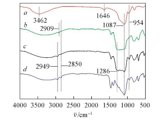 圖2為SiO?顆粒改性前后的紅外光譜圖。在裸露的SiO?顆粒(圖2譜線a)上,3459 cm?1處出現(xiàn)羥基的氫氧鍵伸縮振動吸收峰,1646 cm?1處是納米SiO?表面吸附水的氫氧鍵振動吸收峰,而在改性的顆粒上這2處吸收峰強度有所降低甚至消失,這是由于SiO?顆粒表面的硅羥基(Si—OH)與硅烷偶聯(lián)劑發(fā)生縮合反應(yīng)而數(shù)量減少,并且改變了顆粒表面與水之間氫鍵的鍵合密度;在圖2譜線b~d中,2949處和2850 cm?1處的吸收峰可分別歸屬為甲基和亞甲基上的碳氫鍵伸縮振動;并且這些吸收峰強度增加,說明甲基和亞甲基數(shù)量增加。在1170~1286 cm?1間的峰為—CF?、—CF?的伸縮振動峰,由于—CF?、—CF?的伸縮振動峰與1087~1200 cm?1間的硅氧鍵伸縮振動吸收峰重合,從而導致圖2譜線b~d中1087~1286 cm?1間的吸收峰變寬,并且吸收峰強度依次減弱,說明—CF?、—CF?數(shù)量減少。綜上所述,可初步說明納米SiO?表面被不同比例的碳氫鏈和氟碳鏈覆蓋。