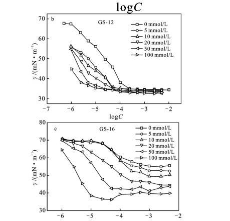 圖5表面活性劑GS-12,GS-16,GS-18溶液的表面張力隨濃度變化曲線(a)和Gemini表面活性劑的表面張力隨KBr鹽濃度的變化曲線(b~d)