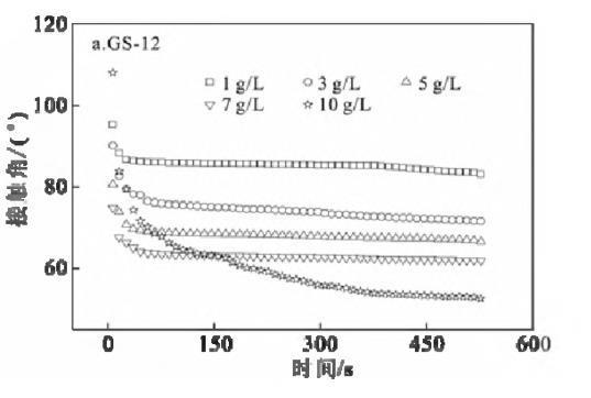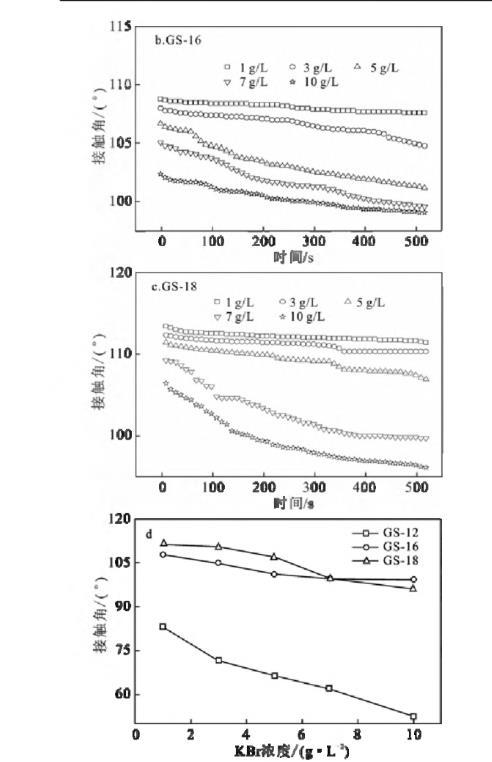 在KBr濃度區(qū)間1~10 g/L內(nèi),GS-12隨著KBr濃度的增加,接觸角顯著減小,而GS-16和GS-18則變化不明顯。可以解釋為:對于GS-12而言,KBr濃度越高,固/液界面處的填料越緊密,導致氣/液固界面張力值降低,而疏水鏈較長的GS-16和GS-18其自身降低界面張力的能力有限,所以,隨KBr濃度增加,接觸角變化有限[1,19]。此外,隨著KBr濃度的增加,液滴在石蠟膜上的接觸角值減小。