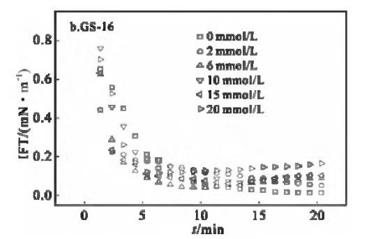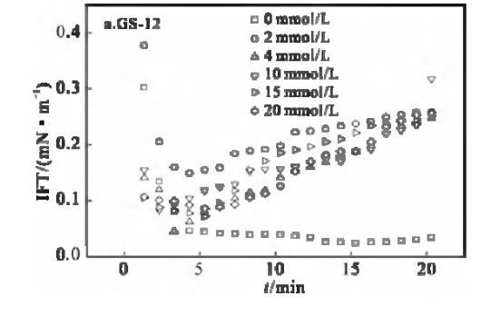表面活性劑/油體系的動態(tài)界面張力行為,對驅(qū)油過程具有重要意義。動態(tài)界面張力是驅(qū)油過程中各種復雜物理化學反應的具體體現(xiàn)。因此,研究動態(tài)界面增長力及其影響因素非常重要。溶液中離子強度增加,將影響表面活性劑分子在水相中的溶解度,改變雙電層參量,而導致油水界面表面活性劑濃度的改變。一般情況下,添加的鹽可以通過中和表面活性劑分子在界面上頭基的電荷來減弱表面活性劑分子之間的靜電斥力,導致IFT降低[5]。溫度為30℃下,不同KBr鹽濃度下,GS-12,GS-16的煤油/表面活性劑溶液界面張力隨時間的變化曲線見圖6。