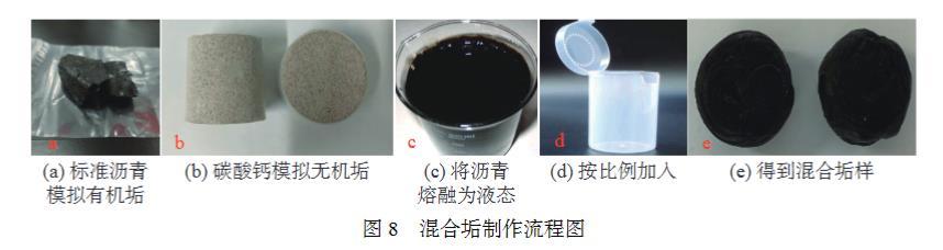采用瀝青塊模擬有機垢,碳酸鈣(灰巖)模擬無機垢,瀝青和碳酸鈣3∶7混合物模擬混合垢。混合垢樣制作步驟如下:①將瀝青塊敲成小塊放入燒杯;②控溫磁力攪拌器將瀝青融化為液態;③將液態瀝青趁熱導入塑料試管中;④再按比例加入碳酸鈣,在瀝青凝固前攪拌均勻;⑤得到比表面積接近混合垢(瀝青碳酸鈣質量比為3∶7),混合垢制作流程圖見圖8。