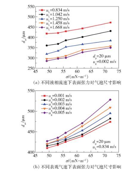 在表觀氣速ug=0.1-0.3 m/s范圍內,表面張力對氣泡尺寸的調控作用呈現非線性特征。當ug>0.2 m/s時,高表觀氣速引發的慣性力(Fg=πd2ρgug/4)增強,部分抵消了低σ帶來的尺寸減小效應。實驗數據顯示,在ug=0.3 m/s條件下,σ從72降至49 mN/m僅使dav減少18%,較ug=0.1 m/s時的32%減幅顯著降低。
