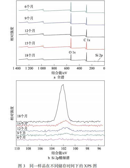 為了探究噴鋁紙表面析出的小分子物質的成分,筆者通過XPS分析儲存時間為6個月、9個月、12個月、15個月、18個月紙張表面元素的變化,見圖3a。在XPS光譜圖中,可以觀察到C 1s,O 1s的特征峰,結合能分別為285.1、532.3 eV。第18個月紙張的XPS光譜圖中,出現了Si 2p的特征峰,結合能為102 eV。由圖3b和表4可知,6—15個月硅含量逐漸增加,元素原子數分數由0增至0.6%,但均未出現成型的峰。18個月的紙張表面硅原子數分數劇增為3.5%。這表明隨著儲存時間增加,紙張表面逐漸有含硅的無機小分子析出。此外,由表4也可看出,18個月的樣品表面C原子數分數明顯升高,從69.9%升至75.1%,O原子數分數則由29.5%降低至20.0%,證明硅主要以Si?C鍵的形式存在,析出的有機硅形成了低分子物質弱界面層,降低了樣品涂層的表面張力。