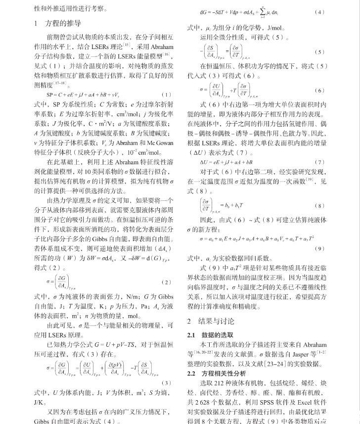 本工作提出一種將σ這一宏觀物性與微觀分子間作用力相關(guān)聯(lián)的一種新的計(jì)算方法。根據(jù)線性溶劑化能量關(guān)系(LSERs)理論和經(jīng)驗(yàn)方程,提出了在不同溫度下估算純有機(jī)物σ的關(guān)聯(lián)式。利用所得關(guān)聯(lián)式對2 628個(gè)純組分體系中的10個(gè)同系物進(jìn)行了回歸,得到了σ的關(guān)聯(lián)方程,并對方程的相關(guān)性和外推適用性進(jìn)行考察。